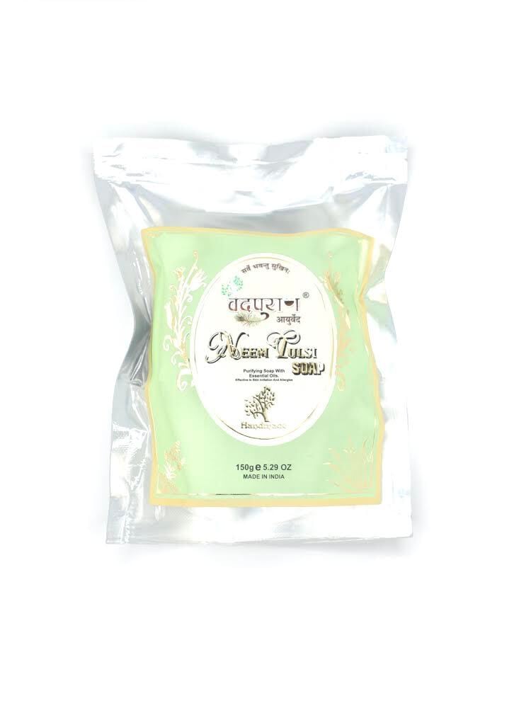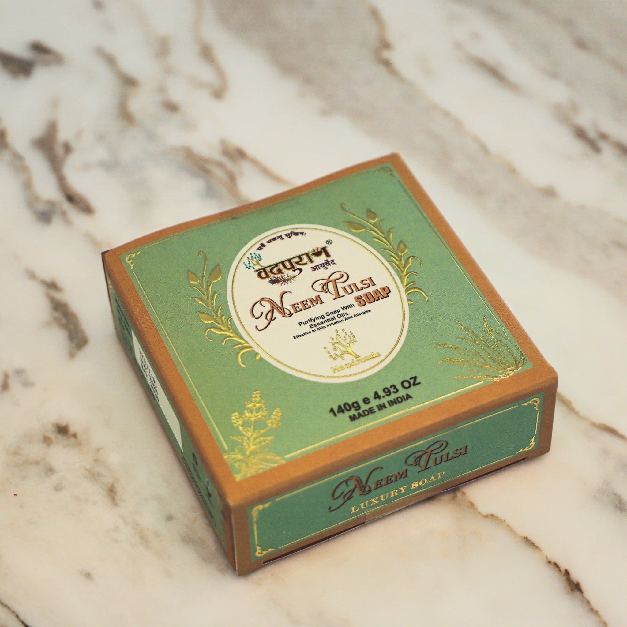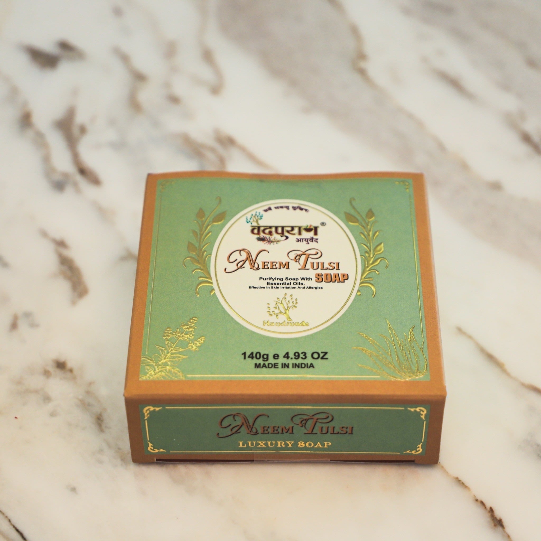 自然の恵みが凝縮されたニームトゥルシーソープ、レギュラーサイズ140g。日焼けによるダメージや肌トラブルやニキビに悩んでいる方にもおすすめです。